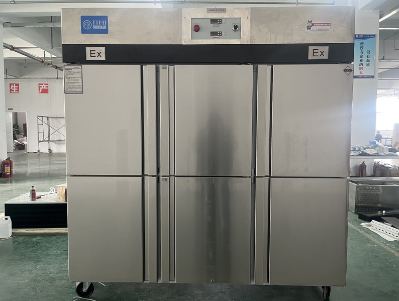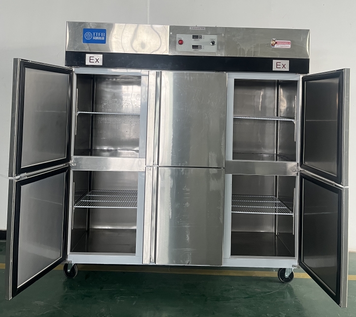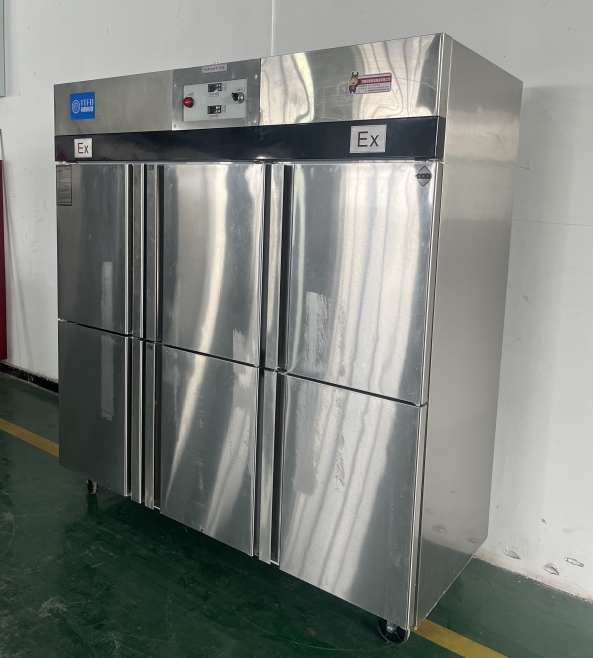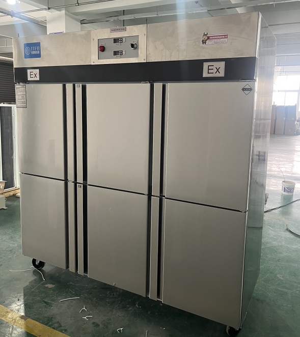 我公司生產(chǎn)的六門(mén)不銹鋼同騰防爆冰箱(以下簡(jiǎn)稱防爆冰箱),產(chǎn)品防爆要求是根據(jù)GB3836.1-2010《爆炸性環(huán)境 第1部分:設(shè)備 通用要求》、GB3836.2-2010《爆炸性環(huán)境 第2部分:由隔爆外殼“d”保護(hù)的設(shè)備》、GB3836.4-2010《爆炸性環(huán)境 第4部分:由本質(zhì)安全型“i”保護(hù)的設(shè)備》、GB3836.9-2006《爆炸性氣體環(huán)境用電氣設(shè)備 第9部分 澆封型“m”》及GB3836.15-2017《爆炸性氣體環(huán)境用電氣設(shè)備 第15部分:電氣裝置的設(shè)計(jì)、選型和安裝》的規(guī)定制成防爆結(jié)構(gòu),經(jīng)國(guó)家授權(quán)的質(zhì)量監(jiān)督檢驗(yàn)部門(mén)檢驗(yàn)合格,其防爆標(biāo)志為ExdbibmbⅡCT4 Gb。適用于工廠存在或可能存在ⅡA、ⅡB級(jí)、ⅡC,T1~T4組可燃性氣體、蒸氣與空氣混合形成的爆炸危險(xiǎn)1區(qū)或2區(qū)場(chǎng)所。該產(chǎn)品經(jīng)國(guó)家防爆電氣產(chǎn)品質(zhì)量監(jiān)督檢驗(yàn)中心檢驗(yàn)合格并取得了防爆合格證??照{(diào)機(jī)廣泛適用于石油、化工、冶金、制藥和國(guó)防工業(yè)等空氣中存在爆炸性氣體混合物的自封閉的室內(nèi)之用。